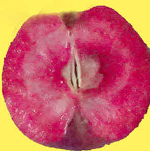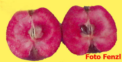 Ein sehr saftiger, feinsäuerlicher Apfel mit rotem Fruchtfleisch. Schorfresistent.